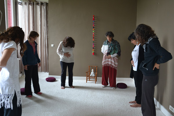 La pratique se fait un temps debout et un temps assis sur une chaise ou allongé sur un tapis.